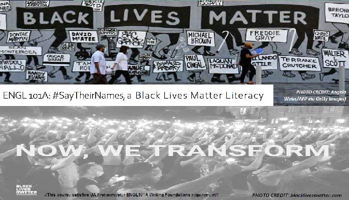 A flyer created to promote the “ENGL 101A: #SayTheirNames, a Black Lives Matter Literacy” course explains its goal: