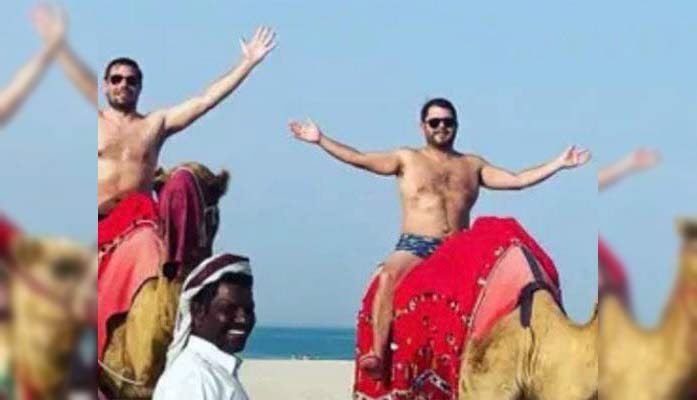A photo of Swalwell and the lesser known Gallego, sans shirts and atop camels sparked outrage and fueled jokes on Twitter after Business Insider published it on Friday.